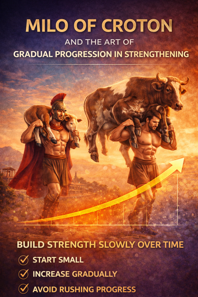The story goes that Milo, a six-time Olympic champion, began his extraordinary strength training journey by lifting a newborn calf. Each day, as the calf grew, so did Milo’s strength. Eventually, he achieved the awe-inspiring feat of carrying a full-grown bull on his shoulders. This ancient tale reflects a timeless truth – strength is cultivated through consistent, incremental efforts.
